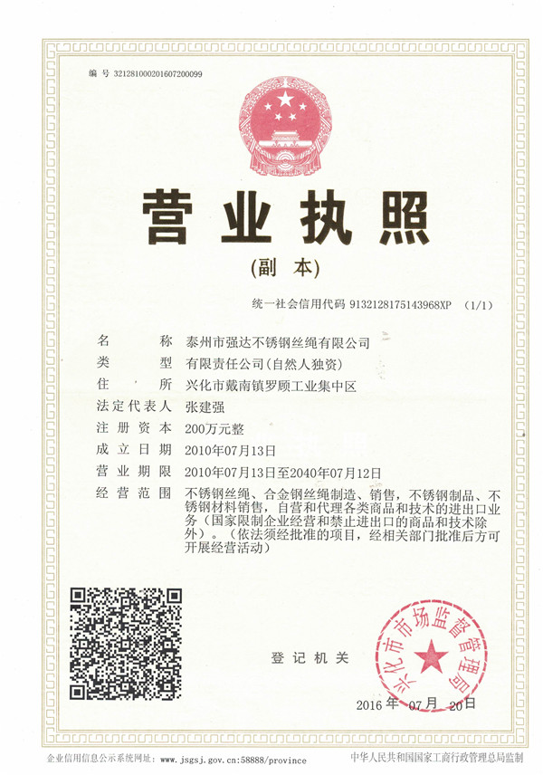 泰州市強達不銹鋼絲繩有限公司位于江蘇興化市戴南經濟開發區,公司致力于不銹鋼絲繩產品生產,立志成為“國內技術標桿型吊索具生產企業”。以此戰略思想指導,公司堅決貫徹“質量贏市場,管理增效益,誠信贏天下”的質量方針。以完善的服務在國內不銹鋼絲繩市場樹立良好的品牌形象。公司榮獲“江蘇省質量信得過企業。 靈活的管理機制,經驗豐富的